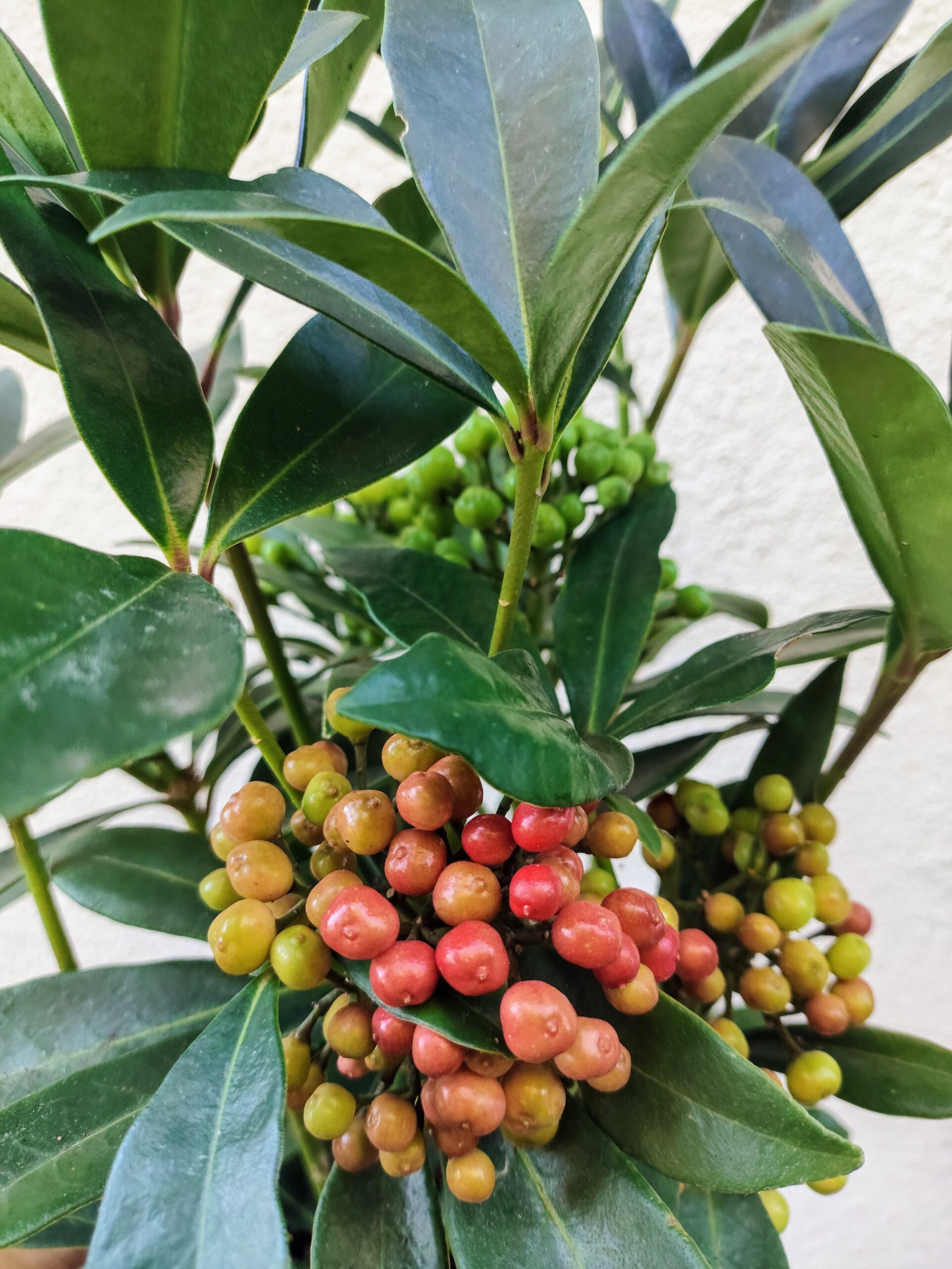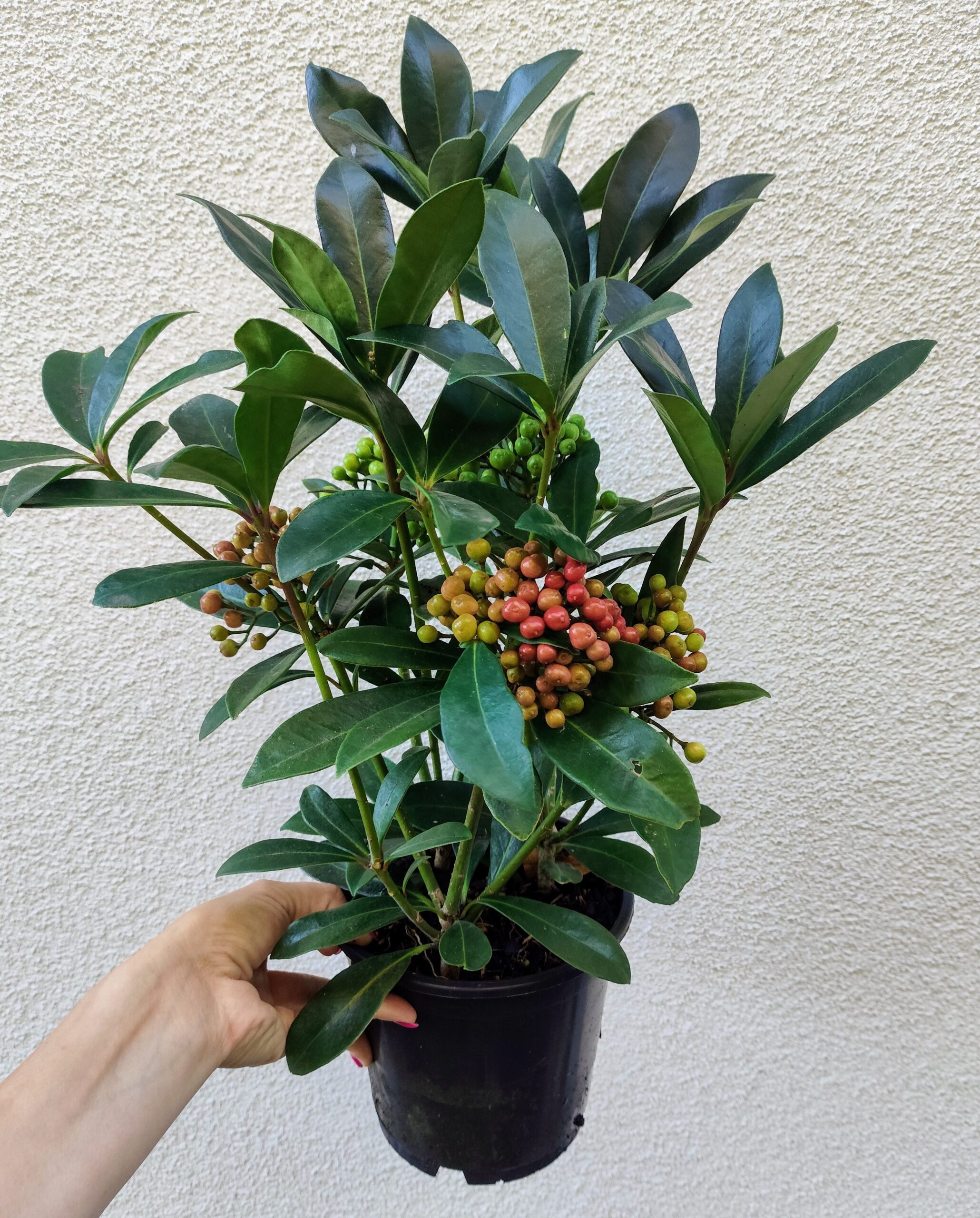 Skimmia japońska to zimozielony krzew ozdobny. Charakteryzuje się błyszczącymi, skórzastymi liśćmi utrzymującymi się przez cały rok oraz ozdobnymi owocami, które dojrzewając przybierają czerwony kolor na jesień. Z pąków kwiatowych (utworzonych jesienią) ukazują się drobne, liczne pachnące kwiaty o różowo-bialej barwie. Skimmia charakteryzuje się gęstym, zwartym pokrojem. Idealnie sprawdzi się do nasadzeń w donice na tarasy i balkony, bądź w każdym przydomowym ogrodzie. Wielkość rośliny wraz z donicą +/- 50cm.