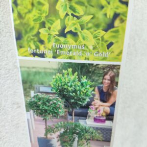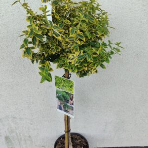 Trzmielina 'Emerald Gold’ to zimozielony krzew szczepiony na pniu. Liście jajowate, zielone z żółtymi brzegami. Idealnie nadaje się do nasadzeń do donic oraz w miejscach wyeksponowanych. Preferuje stanowiska słoneczne jak i półcień. Wielkość rośliny wraz z donicą +/-90cm.